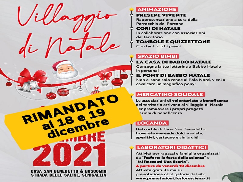 Villaggio di Natale a casa Caritas rimandato causa maltempo. L’allerta meteo e la situazione complicata per molti senigalliesi ci fa decidere di rimandare al prossimo fine settimana, 18 e 19 dicembre, il Villaggio di Natale. Annullati invece i laboratori e le attività di Fosforo e Mi racconti una storia a Casa San Benedetto e a Boscomio per la giornata di oggi, sabato 11, mentre per domani, domenica 12, sarà bene seguire gli aggiornamenti sulla pagina FB di Caritas Senigallia Onlus e il sito www.fosforoscienza.it.