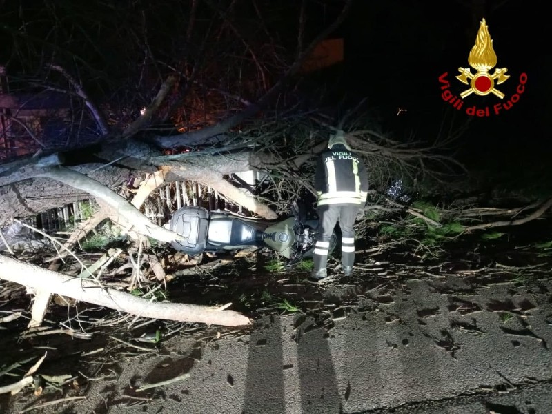 I vigili del fuoco sono intervenuti poco dopo le ore 19:30 di lunedì 10 gennaio a Senigallia in via Camposanto Vecchio per una moto finita contro un pino caduto sulla sede stradale.