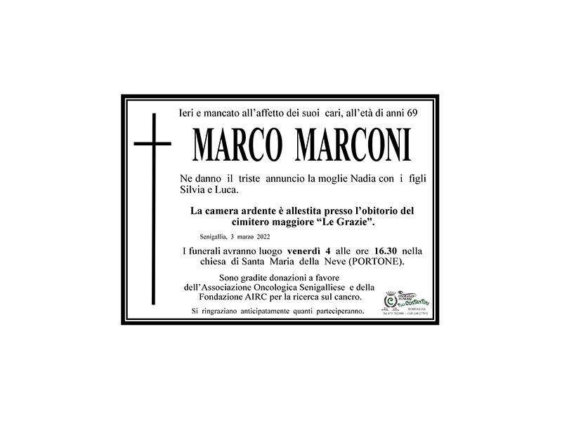 Ieri è mancato all’affetto dei suoi cari, all’età di anni 69 Marco Marconi.
