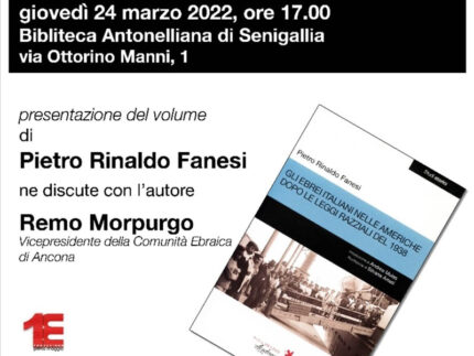 Giovedì 24 marzo alle ore 17,00, presso la Sala Conferenze della Biblioteca Antonelliana si terrà un incontro con lo scrittore Pietro Rinaldo Fanesi che presenterà il suo libro “Gli ebrei italiani nelle Americhe dopo le leggi razziali del 1938”, iniziativa curata dall’Istituto Gramsci Marche.