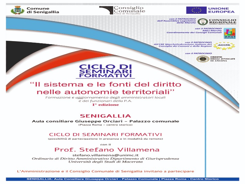 L’Ordine degli Avvocati di Ancona ha patrocinato l’iniziativa, attribuendo a ciascuno dei tre seminari 2 crediti formativi. Info: Ufficio Staff e Segreteria della Presidenza del Consiglio segreteria.consiglio@comune.senigallia.an.it T. (+39) 071 6629372 oppure Area Attività istituzionali – Responsabile P.O. margherita.rubino@comune.senigallia.an.it T. (+39) 071 6629377.