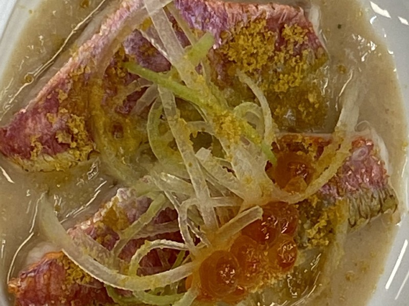 Triglia di scoglio, crema al pane arso, bottarga di muggine e radicchio