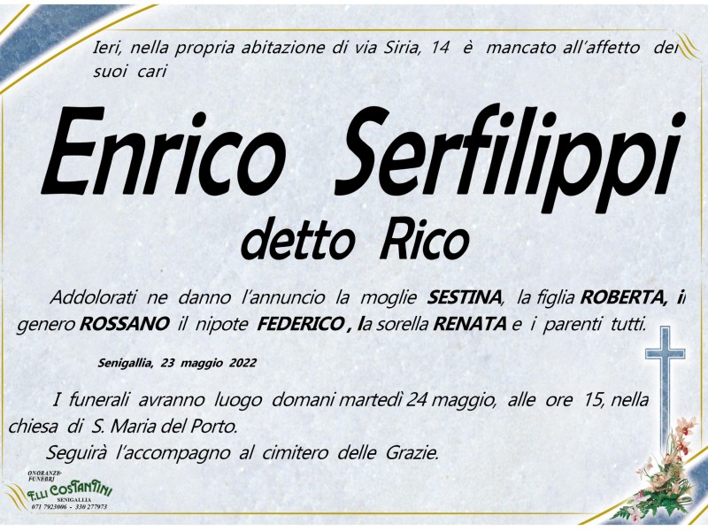 Ieri, nella propria abitazione di via Siria, 14 è mancato all’affetto dei suoi cari Enrico Serfilippi detto Rico.