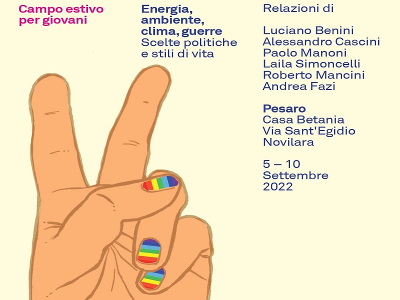 Il campo estivo si terrà dal 5 al 10 settembre a Novilara, in provincia di Pesaro, nella Casa Betania ed è aperto a tutti i ragazzi e le ragazze dai 18 anni in su. Il programma è fitto e intenso, con relazioni di Luciano Benini, fisico sanitario e ambientale, Alessandro Cascini, ex ingegnere oggi agricoltore attento, Paolo Manoni di Banca Etica, Laila Simoncelli, avvocata e responsabile del servizio Diritti umani e giustizia, Roberto Mancini, docente di Filosofia teoretica, e Andrea Fazi, attivista ed educatore ambientale.
