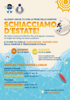 “Schiacciamo d’estate” è la nuova campagna di avvicinamento al volley della US Pallavolo Senigallia che ha affidato alle campionesse regionali juniores e tredicesime d’Italia il compito di accompagnare i bambini e i ragazzi più giovani nella magia di uno sport di squadra che, quest’anno, ha regalato alla città e al territorio un titolo storico.