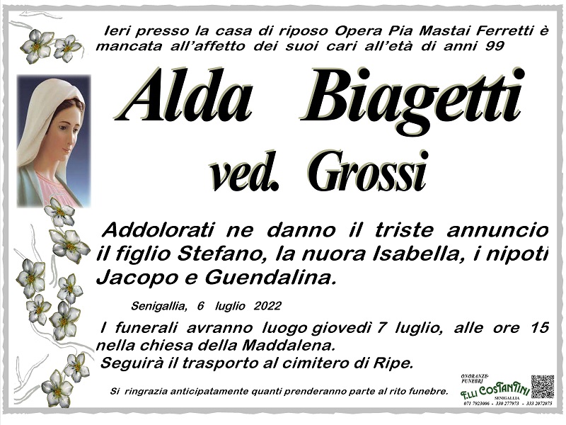 Martedì 5 luglio presso la casa di riposo Opera Pia Mastai Ferretti è mancata all’affetto dei suoi cari all’età di anni 99 Alda Biagetti, vedova Grossi.