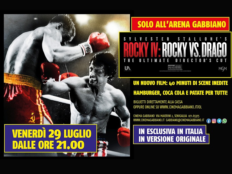 Il Cinema Gabbiano ha deciso di puntare su questo vero e proprio evento fino a farne uno dei cavalli di battaglia delle sue proposte estive: venerdì 29 sarà così proposto in Arena in versione originale e in esclusiva nazionale Rocky IV: Rocky vs. Dragonella nuovissima versione Director’s Cut inedita in Italia (e tra le esclusive sale in tutta Europa a proiettarlo). Il film verrà proiettato in Versione Originale e avrà la stessa durata dell’originale, ma con 40 minuti di scene inedite rivisitate e rimontate da Sylvester Stallone.