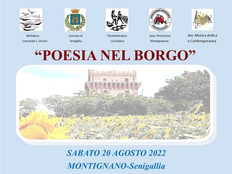 Organizzato dalla Biblioteca Comunale “L. Orciari” con la collaborazione della Compagnia Teatrale “La Sciabica”, con l’associazione “Promotrice Montignanese” e con il patrocinio del comune di Senigallia, nella magnifica piazza G. Bruno ritorna “Poesia nel Borgo”.