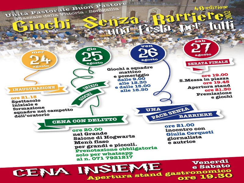 Ecco il programma dell’edizione n. 40 dei Giochi Senza Barriere, che si svolgerà nei campi da gioco della parrocchia in via Gramsci e in piazzale della Vittoria.