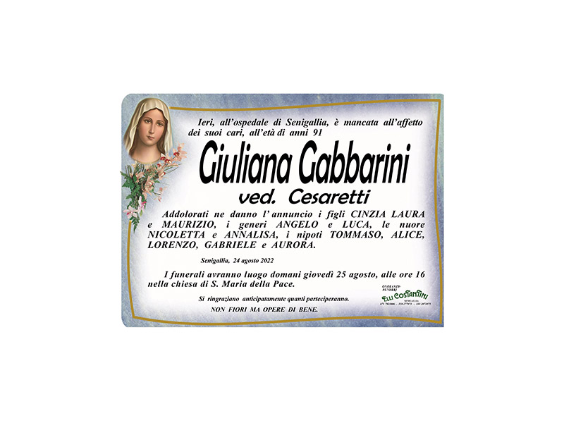 Ieri, all’ospedale di Senigallia, è mancata all’affetto dei suoi cari, all’età di anni 91 Giuliana Gabbarini ved. Cesaretti.