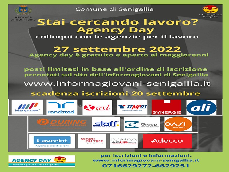 Martedì 27 settembre 2022 ritorna AGENCY DAY, la giornata dedicata al lavoro organizzata dall’Informagiovani del Comune di Senigallia, durante la quale le Agenzie per il Lavoro e i candidati avranno la possibilità di incontrarsi gratuitamente, per colloqui di lavoro individuali.