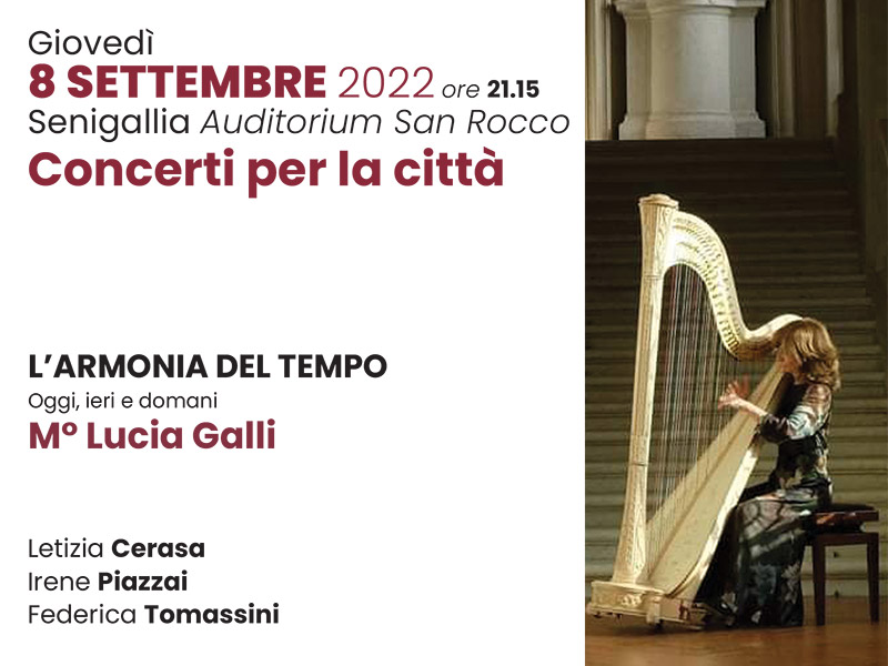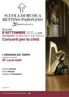 Il primo dei tre eventi si terrà giovedì 8 settembre 2022, all’Auditorium San Rocco, alle ore 21.15 on protagonisti gli allievi di oggi e del passato della classe di arpa diretta dal M°Lucia Galli.