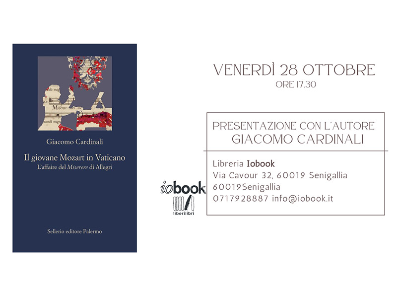 Si svolgerà venerdì 28 ottobre alle 17.30 alla libreria Iobook a Senigallia in via Cavour 32, la presentazione del libro di Giacomo Cardinali “Il giovane Mozart in Vaticano. L’affaire del Miserere di Allegri” edito da Sellerio.