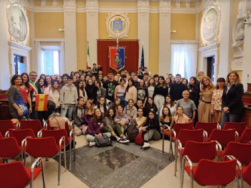 Gli studenti accolti ufficialmente dal Sindaco Olivetti per un saluto di benvenuto nella fastosa cornice della sala del consiglio comunale, hanno poi partecipato ad una visita alla nostra città in chiave ludica, attraverso una gimkana turistica.