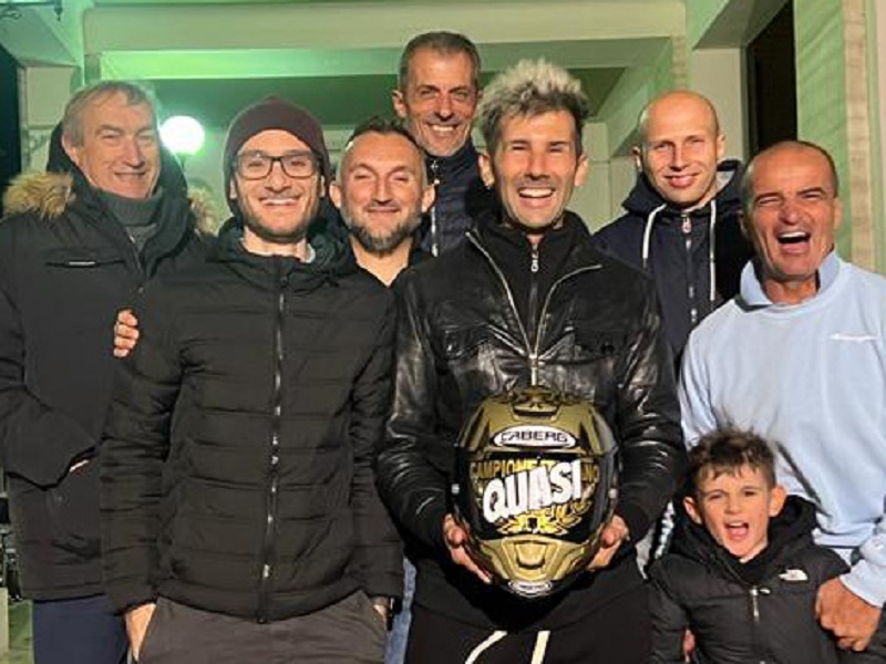 Gli amici del centauro senigalliese gli hanno poi regalato un casco su cui spicca la parola “quasi”, a ricordare con ironia il titolo di campione italiano sfumato proprio a causa della caduta.