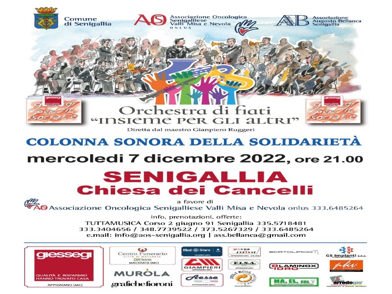 Torna a Senigallia , Mercoledi 7 dicembre prossimo, alle ore 21.00, alla Chiesa dei Cancelli l’Orchestra di fiati ‘Insieme per gli altri’ colonna sonora della solidarietà, diretta dal M° Gianpiero Ruggeri, l’originale ensemble marchigiano nato per sostenere associazioni, progetti di sviluppo, promozione sociale ed umana donando gratuitamente concerti brillanti e di qualità che sanno coinvolgere ed entusiasmare il pubblico.