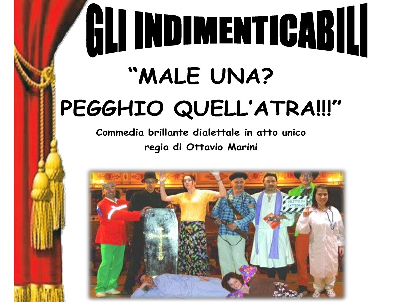 Sarà un giorno speciale quello di venerdì 16 dicembre alle ore 21.15, quando sul palco del Teatro Gabbiano salirà la compagnia de “Gli indimenticabili” che presenterà la commedia brillante in atto unico “Male una? Pegghio quell’atra!!!”, con regia di Ottavio Marini.