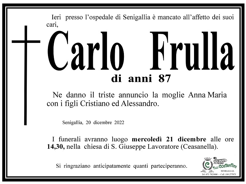 Ieri presso l’ospedale di Senigallia è mancato all’affetto dei suoi cari Carlo Frulla, di anni 87.