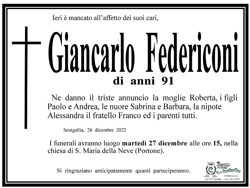 Domenica 25 dicembre è mancato all’affetto dei suoi cari Giancarlo Federiconi, di anni 91.