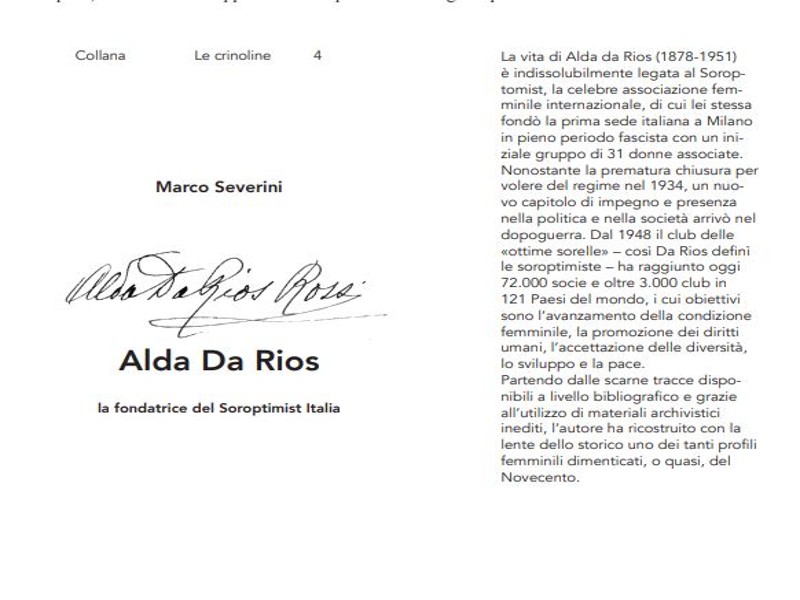 Per la nostra comunità il primo appuntamento è alla Biblioteca “L. Orciari” di Marzocca (Via del Campo Sportivo), venerdì 27 gennaio, alle ore 21.15, con la presentazione del libro di Marco Severini, “Alda Da Rios la fondatrice del Soroptimist Italia” (Ed. Aras, 2022, Collana “Le crinoline”), in allegato la copertina: dialoga con l’autore la prof.ssa e socia Tiziana Casavecchia. La storia di Alda Da Rios non era stata mai raccontata: una donna tenace e volitiva, che seppe affrontare le incognite e i problemi di un frangente delicato (la vedovanza, la Grande guerra, il trasferimento a Milano con i figli, etc.) e a dare origine in Italia all’associazione femminile oggi più diffusa nel mondo, il Soroptimist, fondata nel 1921 negli Stati Uniti da una professoressa di educazione fisica; Alda, di natali veneti, conobbe in Francia nel 1927 la chirurga plastica Suzanne Noël, fondatrice del primo club francese, e rimase affascinata dall’idea che le donne, ancora emarginate dal contesto sociale, potessero ritrovarsi e animare un ente tutto femminile in nome di valori universali come l’amicizia, il dialogo e la tutela dei diritti umani. Una vicenda estremamente interessante, ricostruita con materiali archivistici di prima mano, dispersi in diversi archivi tra Italia e Svizzera, che ha suscitato grande interesse la scorsa settimana a Roma, presso il Soroptimist International Club, riunitosi appositamente presso la Casa dell’Aviatore. Dopo la presentazione marzocchina, l’autore andrà a presentare l’opera, che costituisce un innovativo contributo alla storia delle italiane, in Piemonte, Lombardia e Veneto.