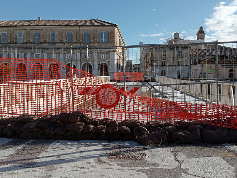 L’onda di piena del Misa del 15 settembre ha incontrato il ponte Garibaldi scavalcando la balaustra e riversandosi a sinistra verso l’ex-Consorzio e a destra lungo i Portici Ercolani. Ai lati del ponte infatti non erano state piazzate paratoie o sacchetti di sabbia per imbrigliare le acque che non hanno trovato ostacoli.