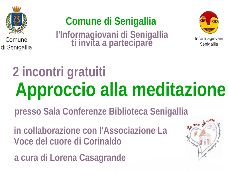 Si svolgeranno nel mese di marzo due incontri gratuiti e aperti a tutti, dedicati alla meditazione. Dopo gli incontri dedicati all’Efficacia Interpersonale, l’informagiovani del Comune di Senigallia ha pensato di arricchire il “Contenitore benessere”, con la proposta di due incontri sulla meditazione che si terranno nella sala conferenze della Biblioteca Antonelliana.