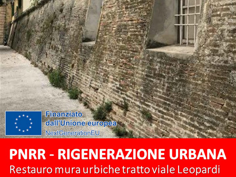 In data 23/02/2023 sono stati aggiudicati i lavori di “Restauro delle Mura Urbiche di Viale Leopardi”. Si tratta del primo di otto interventi finanziati con i fondi del PNRR, Missione 5, Componente 2, investimento 2.1 “Rigenerazione Urbana”.