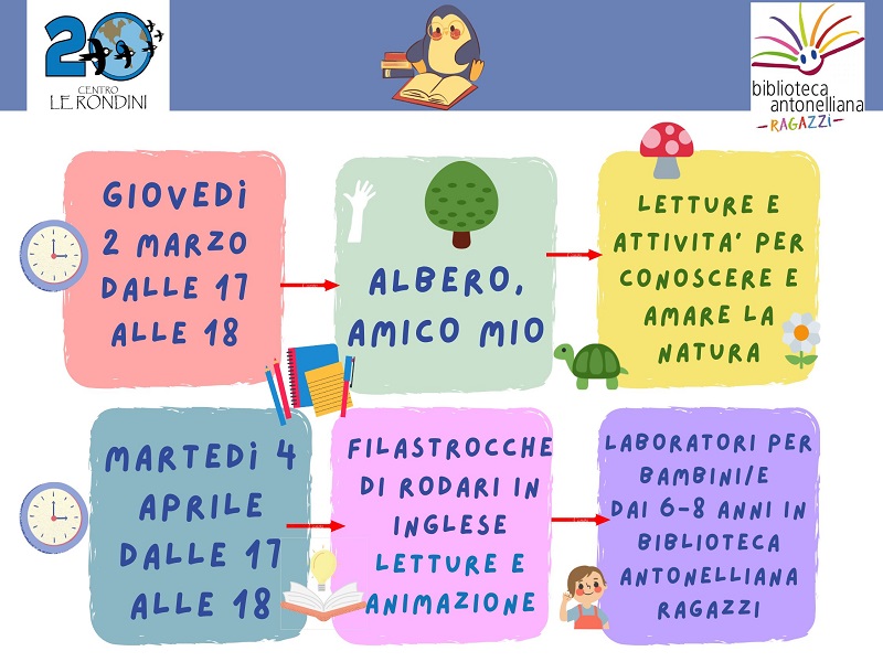 Il centro di aggregazione Le Rondini in collaborazione con la Biblioteca Antonelliana Ragazzi organizza due incontri rivolti a bambini dai 6 agli 8 anni presso la biblioteca.
