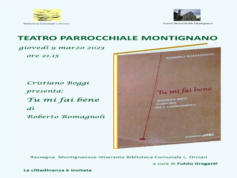 Giovedi 9 marzo 2023, ore 21:15, presso il salone parrocchiale di Montignano, verrà presentato il libro “Tu mi fai bene, strategie brevi per il cambiamento” di Roberto Romagnoli.