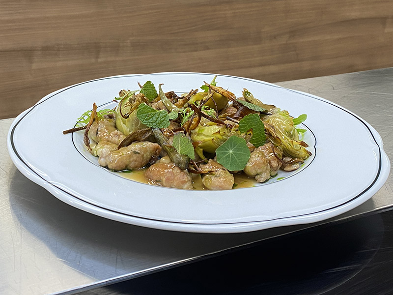 Animelle di agnello con carciofi morbidi e croccanti e mentuccia romana - Ristorante Mercato Trattoria Pop di Senigallia