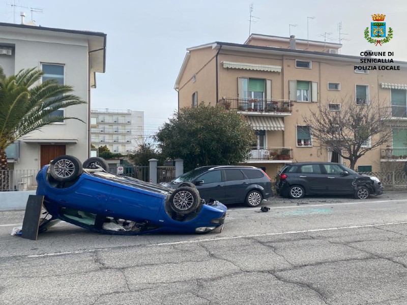 Una Fiat Grande Punto, proveniente da Ancona, a bordo della quale si trovavano due giovani stranieri ma residenti a Senigallia, nati nel 2000 e nel 1996, ha urtato violentemente due auto in sosta, una Fiat 500 L e una Ford Focus. A seguito dell’urto violento l’auto si è ribaltata.