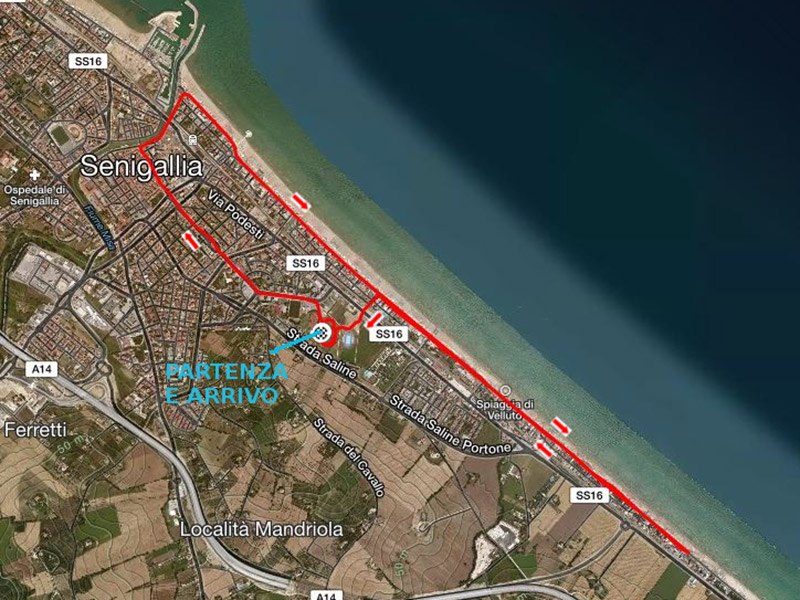 Il percorso prevede partenza e arrivo dalla pista di atletica in zona Saline, l’attraversamento del centro storico (Corso 2 Giugno) transito sul lungomare di levante dalla zona porto, con passaggio di fronte alla Rotonda e giro di boa all’altezza del Hotel Diana e ritorno con arrivo in pista.
