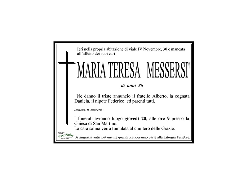 Ieri nella propria abitazione di viale IV Novembre, 30 è mancata all’affetto dei suoi cari Maria Teresa Messersì di anni 86.