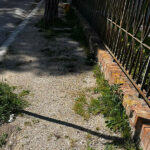 “Fossi una turista, me ne andrei da una città tenuta così”, afferma la donna, una residente della zona, che nei suoi scatti mette in risalto come i marciapiedi siano invasi da erba ed erbacce alte, cresciute a dismisura non solo in prossimità degli alberi, ma anche lungo i bordi e sull’intero selciato, nei tratti che sono cronicamente non asfaltati (situazione che permane sostanzialmente da sempre, questo occorre sottolinearlo!).