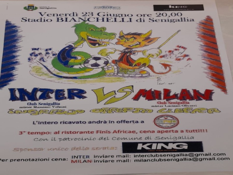 Serata dedicata alla solidarietà venerdì 23 giugno allo stadio Bianchelli, quando alle ore 20 scenderanno in campo le formazioni dell’Inter Club Senigallia e del Milan Club Senigallia.