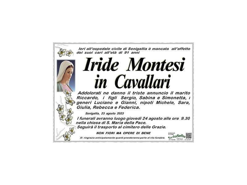 Ieri all’ospedale civile di Senigallia è mancata all’affetto dei suoi cari all’età di 91 anni Iride Montesi in Cavallari.