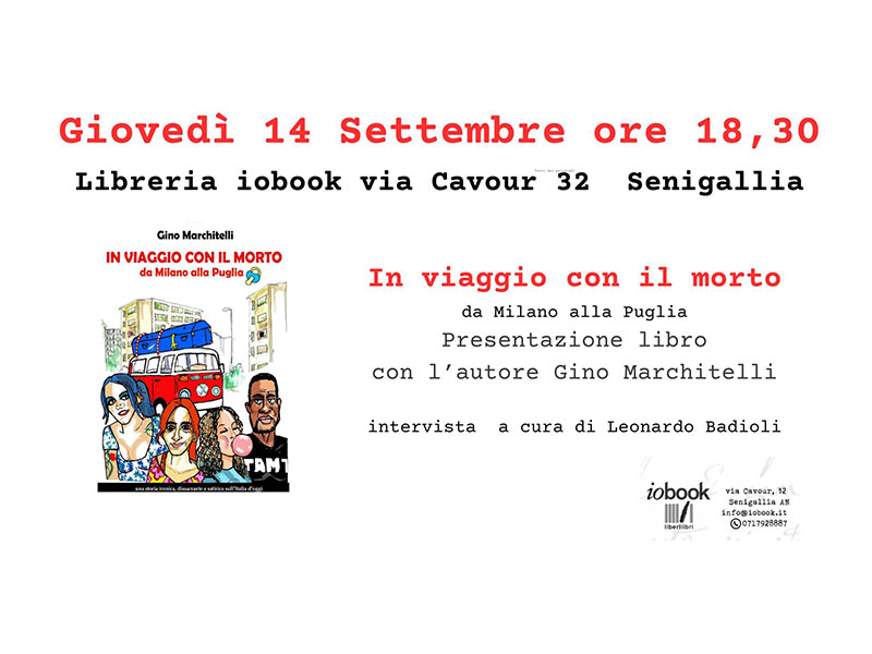 Giovedì pomeriggio, 14 settembre, alle 18,30 presso la libreria iobook, via Cavour 32, ci sarà Gino Marchitelli che parlerà del suo romanzo In viaggio con il morto, da Milano alla Puglia.