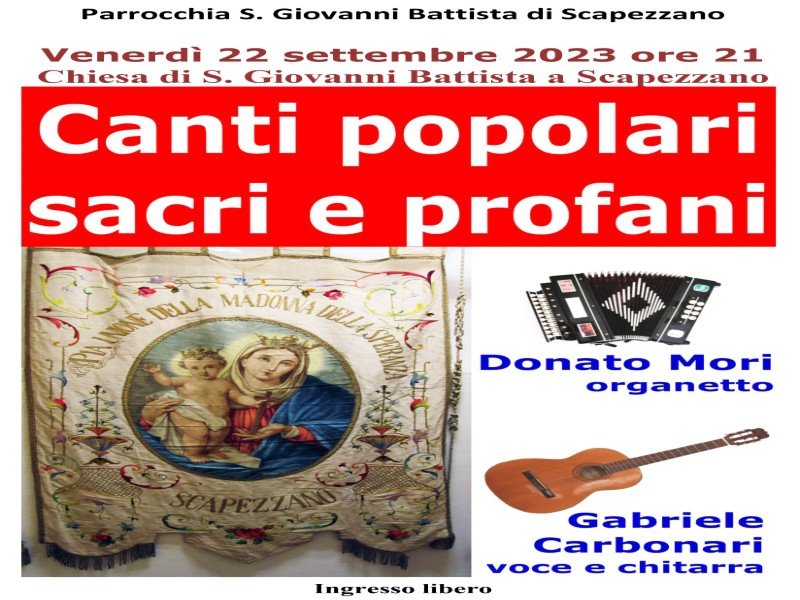 Venerdì 22 settembre alle 21 nella chiesa parrocchiale di S. Giovanni Battista a Scapezzano Donato Mori all’organetto e Gabriele Carbonari alla voce e alla chitarra terranno un concerto di canti popolari sacri e profani, organizzato dalla parrocchia per festeggiare la Madonna della Speranza molto venerata a Scapezzano sin dalla seconda metà del Settecento.