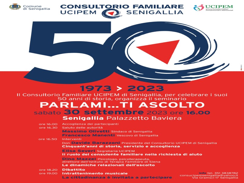 Il Consultorio UCIPEM (Unione Consultori Italiani Prematrimoniale e Matrimoniali ) di Senigallia compie quest’anno cinquant’anni e festeggia questo importante traguardo con un evento che renda onore e merito al grande lavoro svolto dai consulenti familiari in tutti questi anni al servizio della comunità locale e non solo.