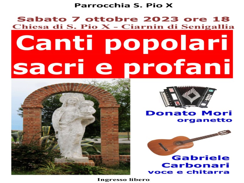 Sabato 7 ottobre alle 18 nella chiesa parrocchiale di S. Pio X a Ciarnin di Senigallia Donato Mori all’organetto e Gabriele Carbonari alla voce e alla chitarra terranno un concerto di canti popolari sacri e profani, organizzato dalla parrocchia per festeggiare la Madonna della Strada e i 60 anni della statua raffigurante la Vergine Maria con il bambino Gesù oggi sul piazzale antistante la chiesa.