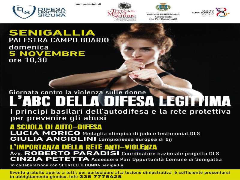 Appuntamento da non perdere domenica mattina, 5 novembre, presso il palazzetto del Campo Boario con una parte dedicata all’approfondimento degli strumenti legislativi ed operativi istituzionali che rappresentano la “rete anti-violenza” e con una seconda parte dedicata – come di consuetudine per DLS – allo studio di alcune tecniche basilari di autodifesa. All’evento, patrocinato dalle Terre della Marca Senone e dal Comune di Senigallia (e con la collaborazione dello Sportello Donna Senigallia), presenzieranno il presidente di Difesa Legittima Sicura Avv. Roberto Paradisi e l’Assessore Cinzia Petetta, da sempre vicina alle iniziative del sodalizio radicato in tutta Italia e che, questa estate, è riuscito a coinvolgere nelle proprie iniziative anche il Presidente della Commissione Affari Sociali del Senato Franco Zaffini che aveva speso parole di autentico apprezzamento per il lavoro culturale, giuridico, sociale ed operativo svolto da Dls. Ad introdurre i partecipanti (l’evento è aperto a tutti e non solo alle donne) alle basi della autodifesa sarà l’olimpionica Lucia Morico, testimonial d’eccellenza di Difesa Legittima Sicura. L’ingresso al palazzetto è libero e chiunque (in tenuta ginnica) potrà cimentarsi in semplici tecniche anti-aggressione di sviamento della forza, sganciamento e sbilanciamento dell’aggressore.