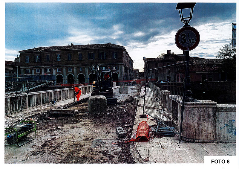 Escavatore in opera su ponte Garibaldi con la contemporanea presenza di due blocchi in calcestruzzo del peso di circa 2 ton./cad.
