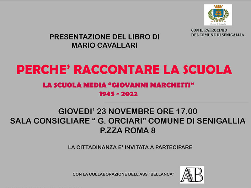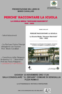 Giovedì 23 novembre alle ore 17, presso la Sala Consigliare “G. Orciari” del Comune di Senigallia, la cittadinanza è invitata a partecipare alla presentazione del libro di Mario Cavallari, “Perchè raccontare la scuola. La Scuola Media ‘Giovanni Marchetti’ 1945-2022”.