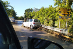 Durante la notte dell’alluvione (15-16 settembre 2022) l’acqua esondata ha invaso la sede della SP.12 dalla rotatoria fino oltre l’incrocio tra SP.12-Corinaldese e via Giuseppe Garibaldi, che si immette da Brugnetto sulla Provinciale, riversandosi poi nei campi a fianco e un’auto che transitava è stata investita dall’acqua, dai tronchi e dalle ramaglie da essa trascinati. Il/la conducente della vettura è riuscito/a miracolosamente a mettersi in salvo (foto del 16 settembre 2022, ore 9:09).