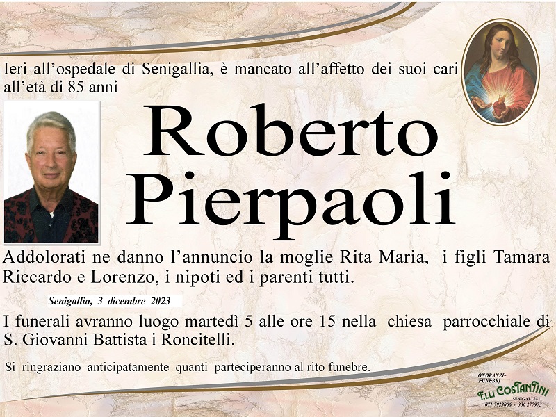 Sabato 2 dicembre all’ospedale di Senigallia è mancato all’affetto dei suoi cari all’età di 85 anni Roberto Pierpaoli.