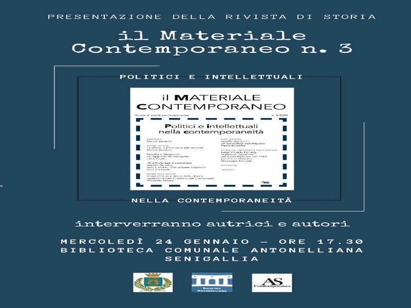 Mercoledì 24 gennaio, alle ore 17.30, presso la Sala Conferenze della Biblioteca “Antonelliana” di Senigallia viene presentato il n. 3 de “Il materiale contemporaneo”, rivista dell’Associazione di Storia Contemporanea.
