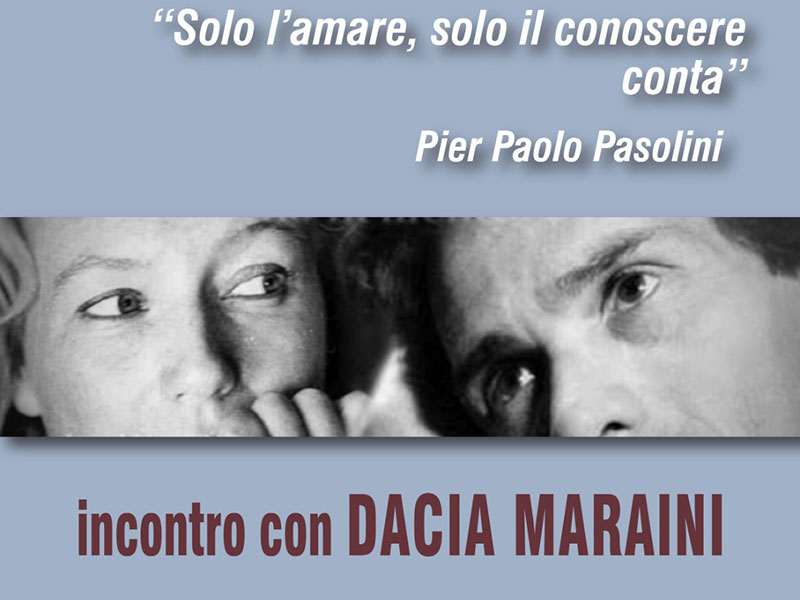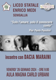 Dacia Maraini ha accolto nel suo recente libro “Caro Pier Paolo” la memoria vitale e commossa della profonda amicizia col grande intellettuale “corsaro” e ne parlerà con gli studenti del Liceo Medi, venerdì 26 gennaio alle 9.00, nell’Aula Magna “Carlo Urbani”, dopo la serata-evento di giovedì alla Rotonda, per la rassegna “In scena senza scena”, curata da Mauro Pierfederici e Alessio Messersì.