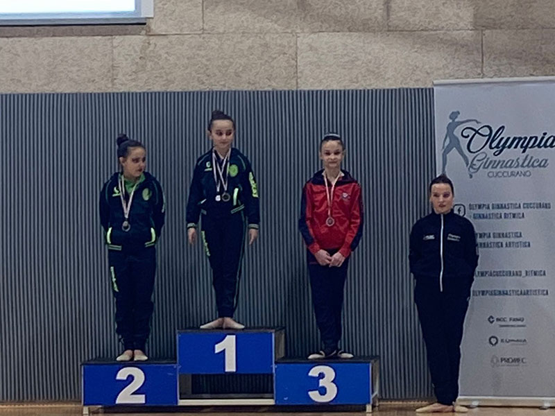 Livello più avanzato, il Torneo Gold che ha visto due ginnaste piazzarsi sul podio regionale e qualificarsi alla fase nazionale che si terrà a Napoli il prossimo Aprile: Rocchetti Irene e Carrieri Gaia si classificano entrambe al terzo posto rispettivamente nelle categorie Junior 2 e Junior 3 eseguendo entrambe esercizi alla palla e alle clavette.