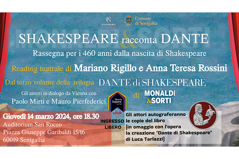 Giovedì 14 giungerà a Senigallia all’Auditorium di San Rocco la rassegna di reading teatrali “Shakespeare racconta Dante”. Mariano Rigillo, in un affiatato tandem con Anna Teresa Rossini, interpreterà passi scelti da Dante di Shakespeare III – Come è duro calle, ultimo volume di una trilogia che narra la vita e l‘opera di Dante Alighieri come se uscissero dalla penna immortale di William Shakespeare.