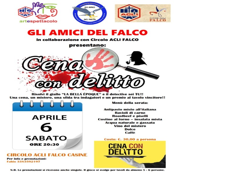 L’associazione “Gli amici del Falco” organizza sabato 06 aprile 2024, presso i locali del circolo ACLI FALCO di Casine di Ostra, una cena con delitto.